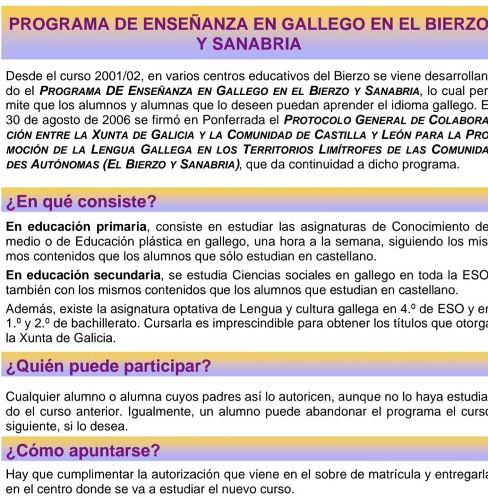 Na comunidade de Castela e León –conforme ao que establece o artigo 4.2 do seu estatuto de autonomía, no que se establece a protección para a lingua galega nos lugares nos que habitualmente se utiliza- a materia de galego está incorporada aos plans de estudo de muitos centros de ensino primario e secundario: