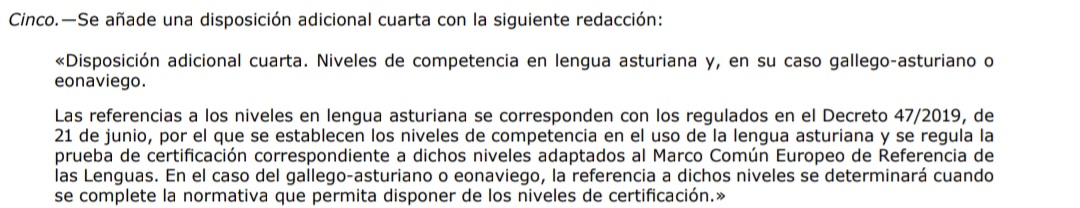 El goberno asturiano acaba de publicar nel BOPA el Decreto 105/2025, de 25 de agosto de primeira modificación del Decreto 63/2018, de 10 de outubro, polo que se establece a ordenación e currículo das enseñanzas de idiomas de réximen especial nel Principado de Asturias e modifica el anterior decreto pra incorporar a enseñanza da “lengua asturiana, y en su caso, del gallego-asturiano o eonaviego a las Escuelas Oficiales de Idiomas del Principado de Asturias que se impartirán de acuerdo con los niveles de competencia que se establezcan reglamentariamente.»