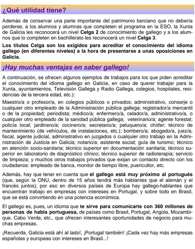 Esta formación debe permitir convalidar os estudios nos centros asturianos polos certificados xa homologados CELGA, que son os que permiten certificar el conocemento que úa persoa ten del galego pra os efectos de xustificar méritos laborales e académicos.
