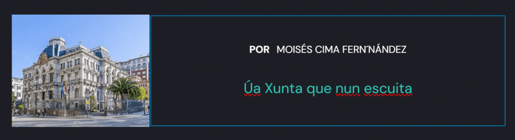 Abro as páxinas del periódico e tópome cun titular: «La Junta se da dos dias para escuchar a 47 implicados en la oficialidad del asturiano», e aínda que nel titular non se mencione, leo nel corpo da noticia que tamén se vai discutir sobre a oficialidá del eonaviego (como discurriron a pasada lexislatura en chamar al galego que se fala nos concellos máis occidentales de Asturias). De primeiras un queda un pouco sorprendido, pois as posiciois dos distintos parlamentarios asturianos están ben definidas, máxime coel novo pacto entre Foro e el PP, nel que el voto de Pumares queda claramente definido del lado dos contrarios á oficialidá. Non creo que as 47 declaraciois valian pra cambiar el sentido del voto de ningún dos deputados da Xunta, nun tema