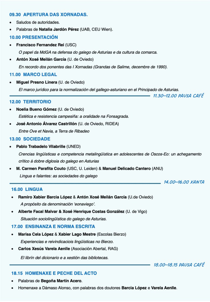 Cremos que será un día importante pral galego de Asturias con ponentes que falarán de historia, Sociolingüística, lingüística, normas e dicionario, del territorio galego-falante, e tamén de sentimentos construtivos que rompen dinámicas de desánimo.