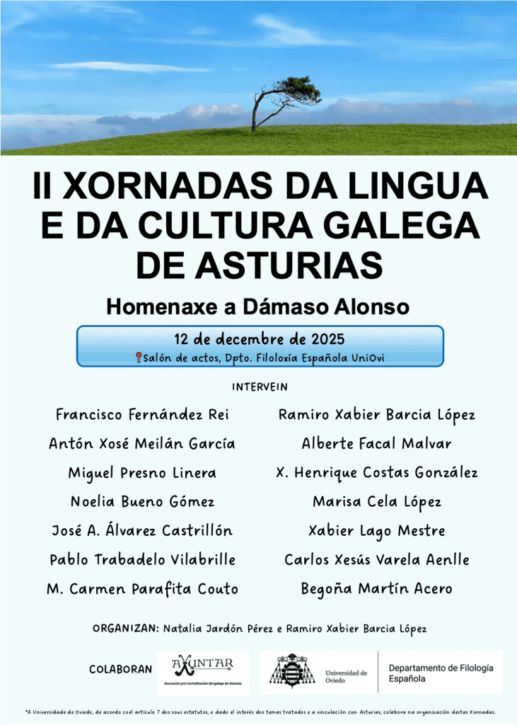 Coa colaboración da Universidade de Oviedo/Uviéu, Axuntar celebra el venres 12 de decembro, na Facultad de Filosofía y Letras: Campus del Milán. C/ Francisco Rodríguez García, s/n 33011 Oviedo/ Uviéu as II Xornadas da lingua e cultura galega de Asturias. El acto comezará ás 9,30 h. A ENTRADA É LIBRE.