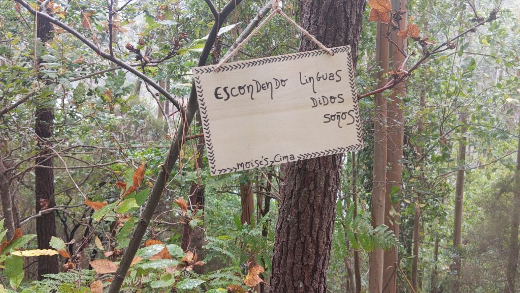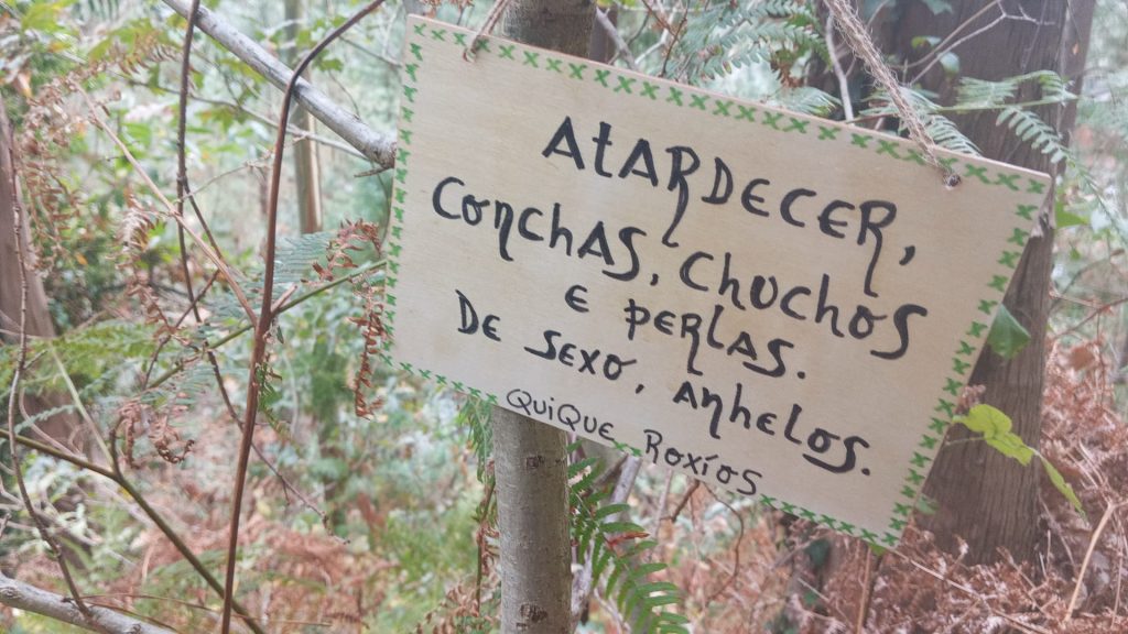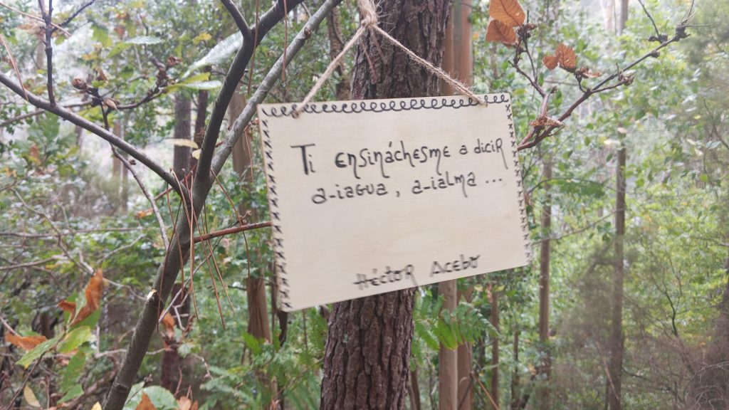 Al atracar collimos os coches de novo e subimos desde El Llombatín al Camín dos volos pra colocar úas tablías poéticas dentro de úa actividade organizada por Axuntar consistente en colocar versos de «Militancia poética» escritos por diversos autores e autoras eonaviegas. Se queredes saber máis, podedes ver esta entrada na nosa web.