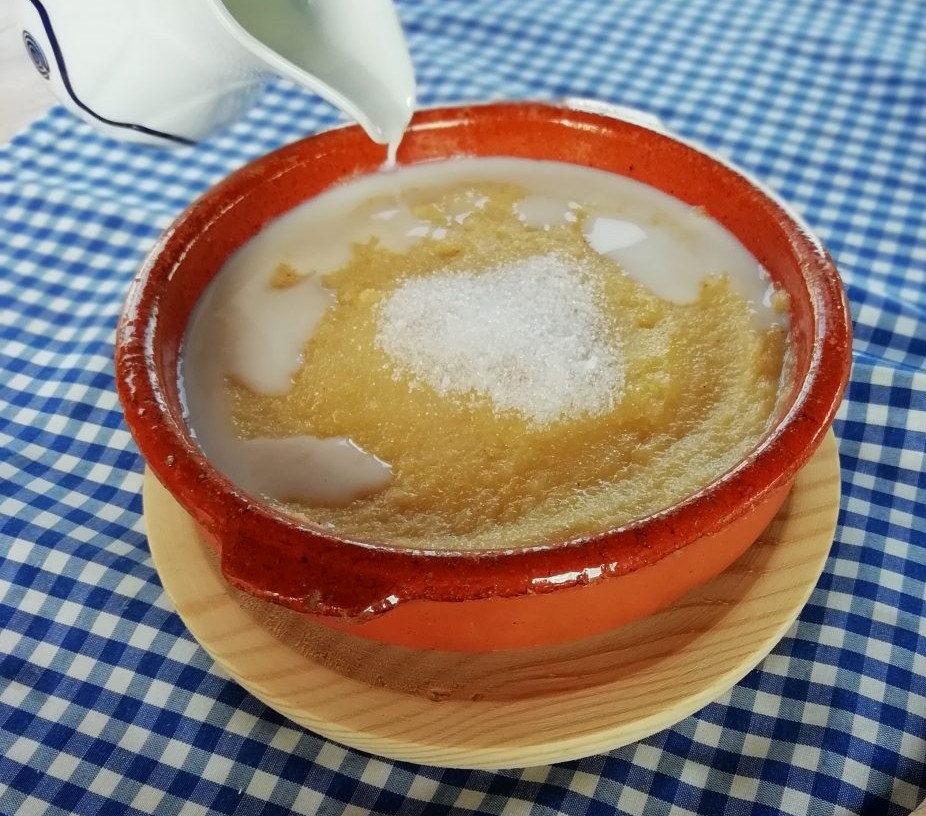 Núa pota puemos 400 ml de auga a ferver con sal (ou si tamos fendo caldo, podemos utilizar esa auga básica). Mentras esperamos a que ferva, diluimos 100 g de faría de meiz en 100 ml de auga fría e mesturamos ben. Úa vez que el auga da pota ferva, amecemos a faría disolta en auga e revolvemos de novo.